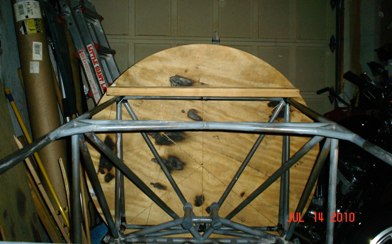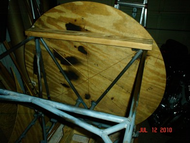 With the fuselage out in the garage, and the 44" diameter circle routed (the plywood engine blank), I thought it'd be kinda nice to have that centered on the firewall so that I could start playing around with the stringer stand-offs.