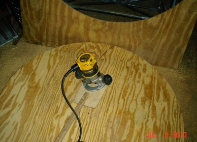 I already had the mounting plate for the router from when I routed the jig for the trailing edge for the Upper Wing Center section. Just a matter of drilling a new hole for the 44" diameter cut. Simple enough... quick solution to making a wooden round "engine."