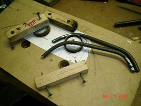 With my discerning eye, it looked to be about 7/8". Drew a jig pattern up on DeltaCAD, printed it out, glue it on, drilled the 7/8" holes to hold the tubing in place, and had at it. Didn't have any 3/8" x .o49 but had quite a bit of .o35. nice... Clamped it down and started pulling on the one end. Got it half-way to where I wanted it and BAM! DAMN ! it inploded on me ! I knew small, thin-walled tubing was hard to bend, but DAMN !