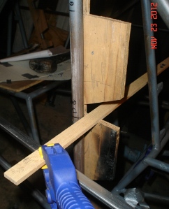 okay, let me back up a few steps... I go out and mark the stand-offs for the stringer locations. I'm all ready to start clamping the stringers to the stand-offs and the first one I clamp it to does a little wobbly thing. Damn !!!, the front formers have been tacked to a set of stand-offs, but, they're only on one side of the former. With it only having the stand-off on the one side, the former isn't locked in position; it can still move front-to-back.