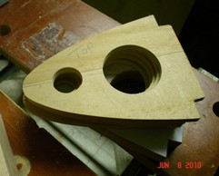 Using a 2" hole saw, I cut the first hole in the nose rib blank that I had made up for routing the nose ribs. Used that as my template for marking all five of the ribs. Finishing up with the first set of holes, I marked a center line on all five nose ribs. Using a 1" forstner bit (love this bit) I drilled a hole in one rib. After marking the center line on the remaining four ribs I used the first rib as a pattern and traced the 1" hole on each. (the center line helped with aligning the forstner bit)