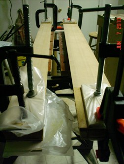Getting back to the work at hand... had the glue mixed... spread it on like I was makin' a PB and J... and clamped her up for the night. I'll be ready to clamp the remaining three pieces of spruce tomorrow night. I better start thinking, now, of how I'm going to make that radius profile the length of the entire trailing-edge. Actually, I've been thinking... and haven't come up wtih a good solution yet. I have some ideas...