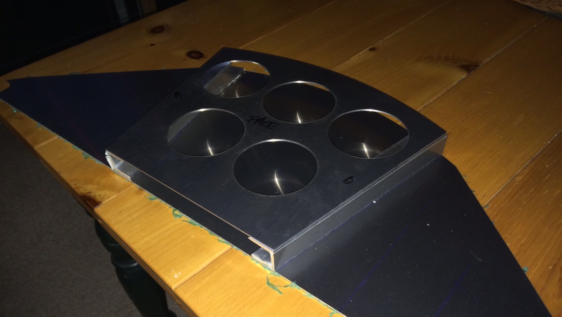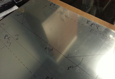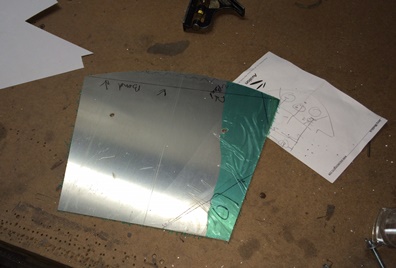 With still another slight change to the look of the panels (I angled the sides of the front panel to match the angle of the stand-offs it fit between. With that being done, I decided to do the same to the back pit... to make them match) I started working on laying the patterns out on the 6061 T6 .063 aluminum sheets that I have.