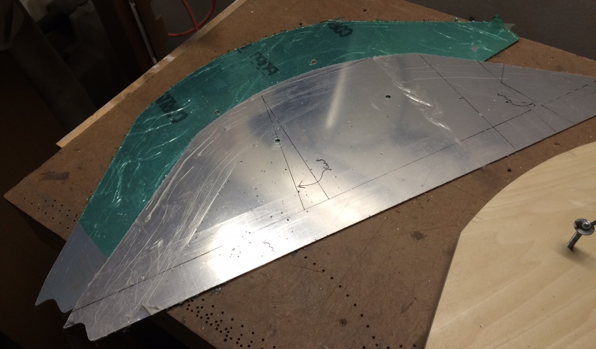 Went out and purchased a few pieces of wood to make the jigs (both front and back) from. Transferred the shapes and cut and sanded to the lines. THEN transferred the pattern on to some .o63 6061 T6 aluminum and rough cut it to shape.
