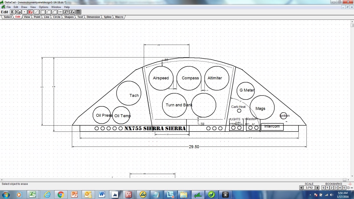 Just not real happy with the look of the final version of the instrument panels that I had drawn up on DeltaCAD. The curve to the straight just didn't really look like it did on the computer screen. Thinking I'm going back to the curved or maybe the straight top and straight sides. Guess it'll be one of those...