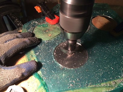 The first two holes... took forever; an hour for each one. A note next time my time on the erase board says "Brutal". I was thinking "I need the patience of Job." What I did was let the cutter drag along the line of the circle not really letting it get up to speed. And what I noticed was I was cutting more of the "wedge" on the inside of the cut more than just a straight-line cut. That's where all the excess material was coming from.