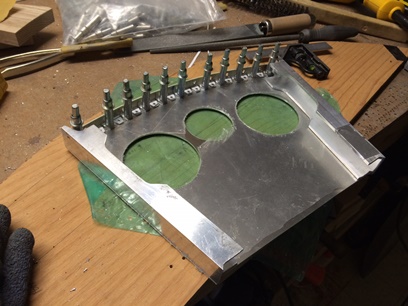 Already had the holes drilled for the rivets to attach the arched piece to the face plate itself. Needed to figure out the spacing of the holes for the screws that will attach the top piece of aluminum to create the shell. But, before figuring out the spacing I needed to figure out what size screw to use, which would determine what size anchor nut plate I would use.