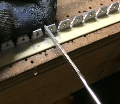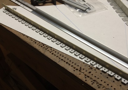 One inch spacing worked for the arched area so I marked for the holes, set up the drill guide on the drill press and started making the starting holes with the centering bit... followed by drilling the final sized holes. Finished with that task I then drilled the relief holes and rough cut the notches on the other leg of the "L" flange. Still need to file and sand smooth.