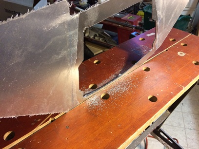 With a four foot sesction of "L" bracket drilled and deburred I was ready for measuring, marking and cutting the two pieces for the first panel. Placement of the flange on the panel was based on where I needed to put the bend; the section that I notched out. Both sides fell out neatly with 19 holes above the notch and two below. NICE !