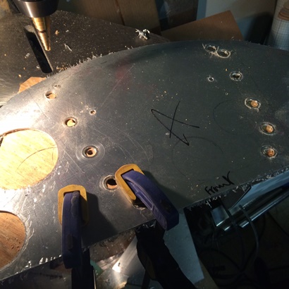Face plate hole drilled I can match drill the "U" channels to it. Same as before; make sure that it's in the correct location, spring clamps to hole in position while I get one of the better clamps to make sure it doesn't move at all. Double... triple check things are in line and I drill the first match-drilled hole. Cleco, then check for alilgnment again... Drill the far off hole. then cleco. Position is now set in stone. If I'm a little off... oh well. But, it isn't, so all is good.