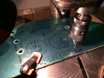 Fast forward about an hour or two and after re-arranging a few of the hole locations I'm finished with the two, 2 1/4inch holes. Decided not to drill the 2 1/4inch hole for the G-meter 'cause I didn't figure in the layout of the mounting holes with the angled face panel. Not an issue...