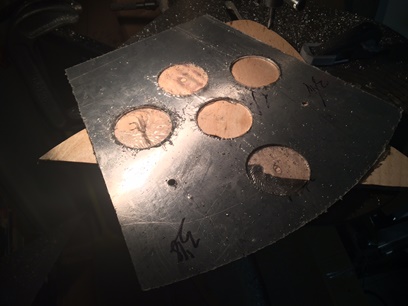 Okay... so I drilled two more 3 1/8inch holes. Need to adjust the adjustable cutter to make three 2 1/4inch holes. I've had enough of the circe makin' for one night.