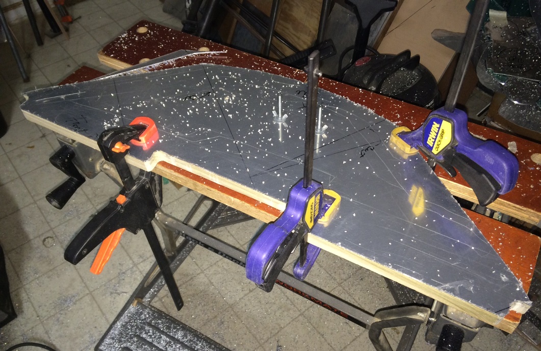A few hours on the project tonight and I should get quite a bit accomplished. First things first... I cut out a piece of .o63 aluminum so that I could route the face plate for the front cockpit's instrument panel. Traced the shape close to save on aluminum. Cut it even closer... Lined up the marks with a flat-edge for routing and clamped it down hard! But... not hard enough. Went to route it and the router grabbed hold of the plastic protection film and pulled the aluminum along with it in a half-ass kind of way. That half-ass kind of way routed a nice curve INTO the piece making it un-useable. DAMN !