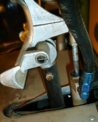 In discussing the Brake Backing Plates, and the mounting of the brakes, we talked about the entire set-up. Took a few pictures of the vertical, remote reservoir, brake cylinders that Whitey is using in his Ford powered Bellanca. I should have gotten a pictue of the PVC Cement can he is using for the reservoir. He gave me an old PVC Cement can so that I could do the same. The reservoirs don't cost that much... but hell, Whitey gave me the can... it's just a matter of brazing on a fitting on the bottom and an air inlet at the top. (I'm now wondering how that will work, the opening at the top, when doing acro. - Just took a look at the Aircraft Spruce site and saw a reservoir that can be unsed for inverted flight... it has an 1/8" NPT male outlet at bottom and filling port with unvented plug at top. Sounds like a plan to me.)