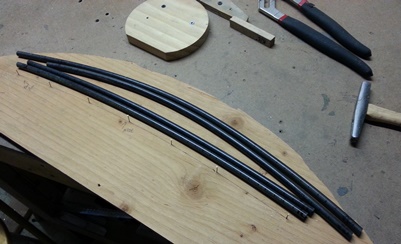 Wanted to find the lightest tubing I could get and found two lengths (lucky me) of .375 x .o28 4130 tubing. Made a few wood and nail patterns to follow for shaping... screwed the bending jig, I made ooooh so long ago, onto the table and started bending some tubing.