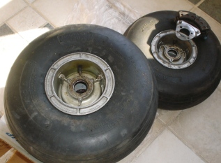 I asked Whitey if he had a few old, worn out tires laying around that I could have (figured he might... having all those planes in the past) and he did. Hopped up into the 40 ft. trailer he has and found a stack of them, along with a stack of tubes. Picked me up some 7.oo x 6's. I'll be looking around in my can of airplane screws to see if I can find the right screws to hold on a few bearing plates. I'll need to make a washer out of cardboard to hold one of the washers in place too. Please Note:I'm making the washer out of cardboard just soes I can get it up on the gear. I'll be replacing the screws AND cardboard washer as soon as I get the replacement parts.