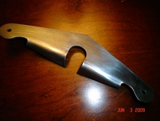 With it looking all nice and pretty, well the edges did at least, I clamped it in the vice and gave it a few good hits with the dead-blow... it worked like a charm. Leaving that extra length on the ears gave me the material I needed for bending it over to 90 degrees. (would have thought I would have known this by now... having that same issue with the .o60 4130 of the stick boot) Before sanding to a silky smooth finish, I took the torch to it to burn off the paper pattern. Once cooled I sanded the surfaces of all scratches.