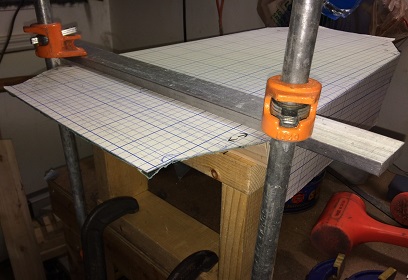 Spent two hours drawing up the "simpler" of the two patterns and gluing it onto the sheet of aluminum that I hacked off of the larger piece.