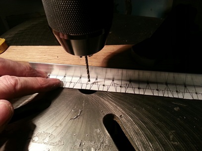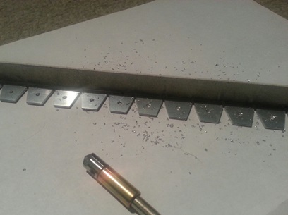 One helluva lot of holes to drill. 252... count them ! 252 holes... And that's not counting the process of me using the centering drill to start the holes for the #40 drill bit... for the rivets. add ANOTHER 126 pulls on the drill press lever. Took all of five hours to drill all those holes. 126 (or there abouts) stress relieving holes for the bend and 126 holes for the rivets.