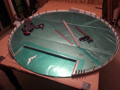no hesitation... plowed right into laying out the firewall. Laid the Big ol' plywood firewall pattern on the stainless sheet and marked the circle... and made a few scratches. DAMN !