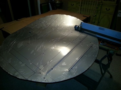 With the stainless steel sheet protected I could start working on cut that big ol' circle out... by hand. 123.25inches for rough cutting the shape out so that I could get a good cut on it without bending the metal too much, then 123.25inches to cut the circle to the line. Two hours... and it looks real nice.