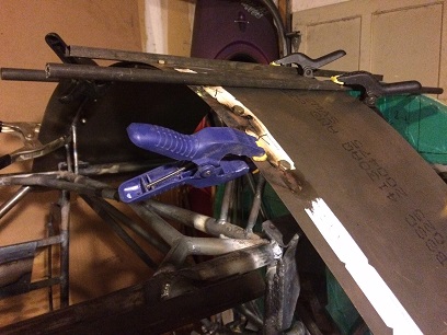Here's a shot of the welded up former with the tab jig in place. The jigging ain't pretty, but I'm not looking for the jigging to be pretty.