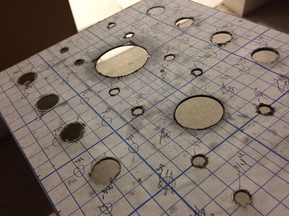 I've got LOTS of ..o32 lying around. Grabbed a nice size sheet and glued on the new pattern I made up for it. Planned on drilling a lot of 3/4inch lightening hole in it but decided to drill a few larger ones. Bad idea... the 1 5/8inch hole took me foooooooreeeeever to make. After trying to make the one hole for what seemed like an eternity, I discovered that the teeth on it weren't sharp anymore so I had to take a file to them.