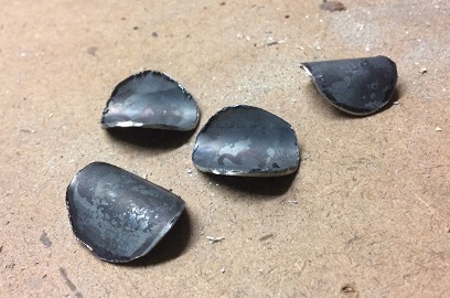 Pulled some .o25 4130 stock I had and cut it into a few 1 1/2inch squares. Held each piece up to its respective hole and drew an oversized circle. Back and forth... back and forth... up and down a set of step over and over again... to get these close to the size before heating them up and wacking them into a wood jig I made for bending them.