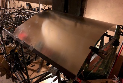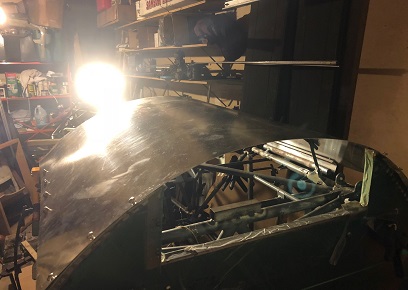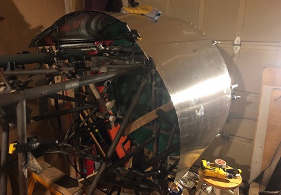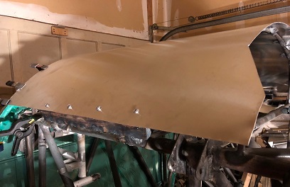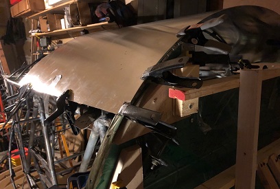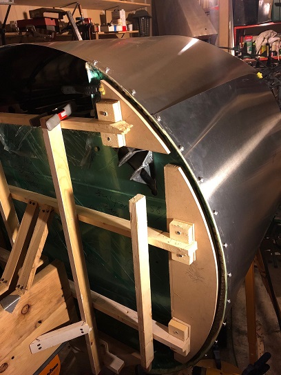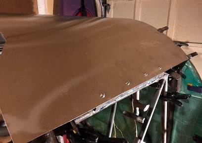 next session... un-screwed thow bolts and clamped the back edge and filed the holes to where they needed to be. Still needs just a little tweak to get it to sit perfect on the rear former. It's a test pattern skin... the second or third one. I'm learning... we'll actually I had learned and had a brain fart and forgot to clamp that back edge. WON'T happen with the final skin.