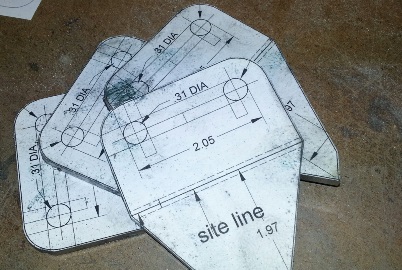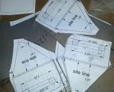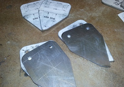 Cut the paper prints out. Glue them on the sheet of .o32 4130. Take the sheet to the metal bandsaw and start cutting, leaving them in rows of four so that it's easy drilling the holes in them. Drill the holes then finish cutting them out of the sheet of 4130. Take them to the grinder and grind them close to size. Finished with that step and I clamp them to the vise and file and sand the edges to size and a 220 smoothness. That's it. They're pretty much ready for bending up and welding on...