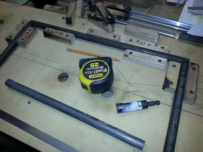 Found one of my older jigs. Flipped it and made some new markings on it. Got the 14inch chop saw out and made a few cuts. All I need to do is make a few notches on the lower end of these tubes and the back end of this puppy is ready to be welded up.