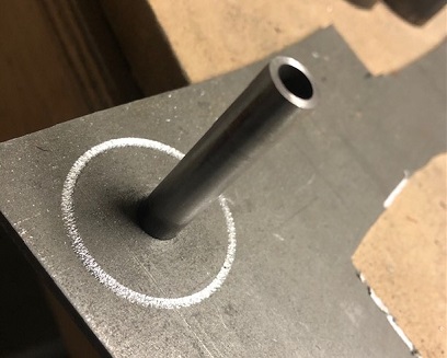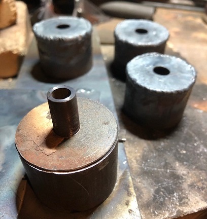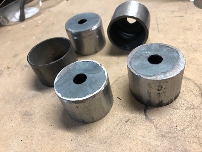 The next day... thought about drilling the holes and how I would go about that once the caps were welded on and decided to re-cut the caps and drill the 3/8inch holes in them before they were fully cut to shape with the hole saw cutter... then all I would need to do is make a simple jig to hold them into place when I weld the first side... then the second side. A whole lot easier than trying to square up the metal bushing on the drill press to drill both hole in the center of each cap... me thinks.