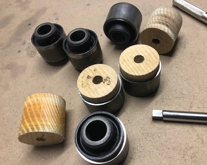 Rubber bushings, wood bushings, and metal sleeves.