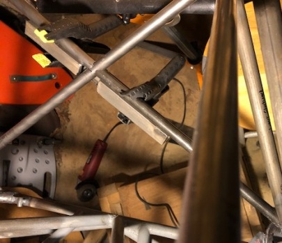 Group photo below... showing the motor mount brackets (without mounting plates) clamped in place, a single motor mount, starboard upper tubes, port lower tube.