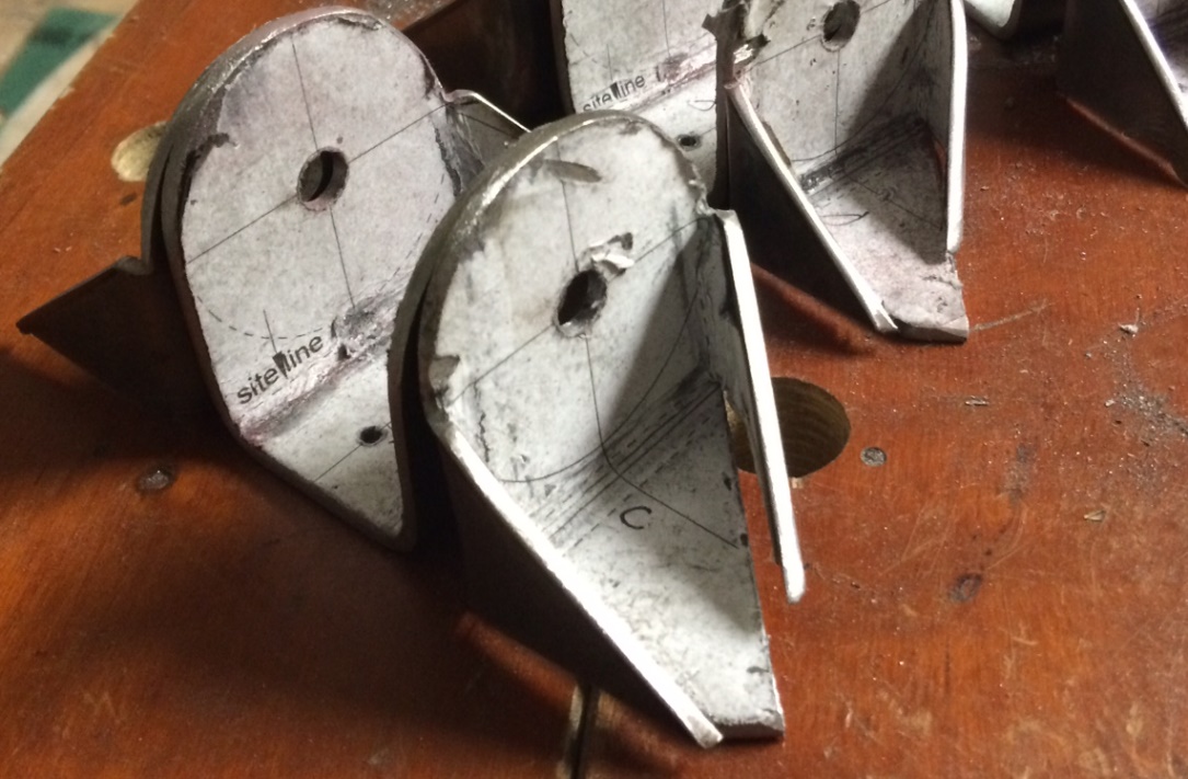 Three sessions today; grind close to lines, files and sand two sets, file and sand remaining two sets. With a little tweaking... they're ready, but I still need to make the bottom plates and the jig for welding them together. I still need to make lathe down the tube/rod that keeps the holes on all three parts aligned.