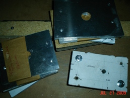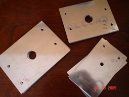 Here they are in all their glory. The set of plates at the upper part of the shot clearly shows the four 1/4" and one 7/8" holes. The smallest plates, in the lower right, are still sandwhiched to the jig. And the others are wrapped up... not too good of a photo for showing what I've done. ahhhh well...