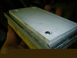 First a gripe with myself. Why I didn't just drill 1/4" holes to begin with is beyond me. Instead I drilled 5/32" holes for the nuts that would keep the plates sandwhiched together. Screws, 1/4", would have done just as well... even better 'cause I wouldn't of had to re-drill the 5/32" holes out to 1/4", thus saving time. You read it here, so don't be drilling 5/32" holes on these pieces.