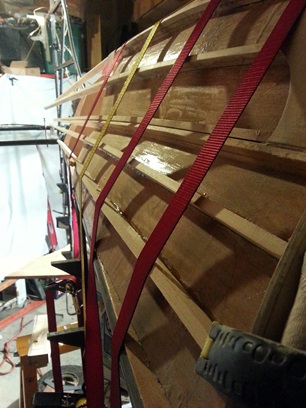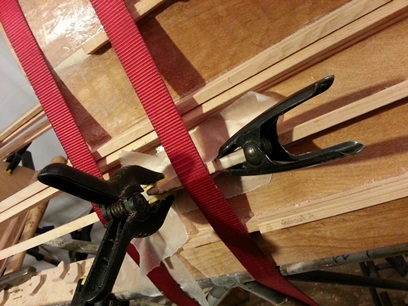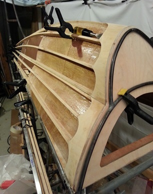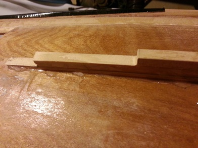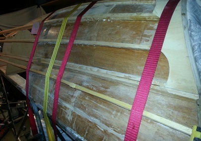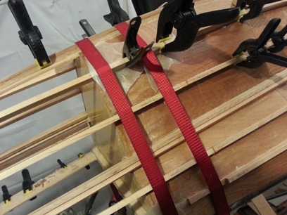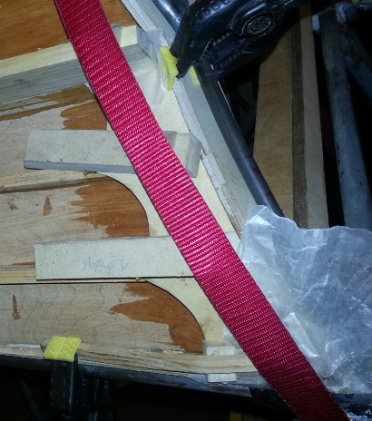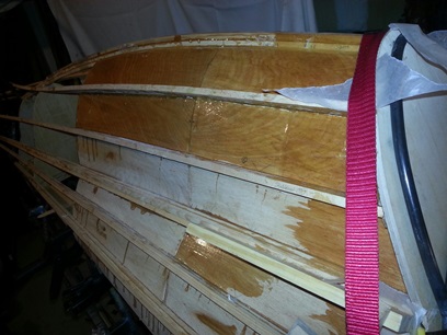 More time on the turtledeck... managed to glue, and keep in place, the starboard side upper ply transition. Wrapping it around the top stringer, and keeping it in place while the glue dries, took quite a few blocks of wood.