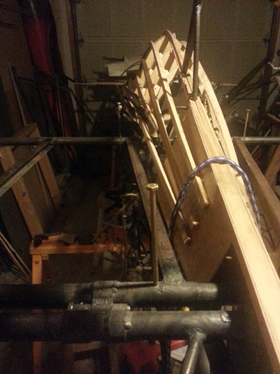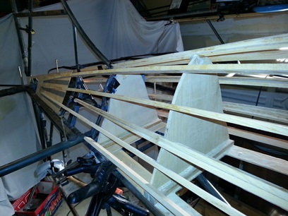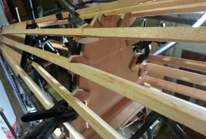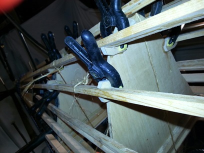 Still need to pull the stringers down into place. Positioned and marked the gussets and then pulled and tied a few of the gussets close to where they need to be. I'll leave the rest for next time... pull them all into close position then take a few measurements, make a few adjustments....