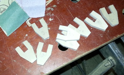 Made the last gussets for the turtledeck tonight... These were for the double-stringers. A little more complex to figure out the shape than the singles but... ya gotta do what ya gotta do. To finish these up all I needed to do was put a slight bevel to them so that the double-stringers sit on them flat. Just a matter of a few passes with one of the micro files.