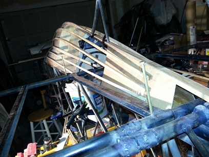 Ended up clamping the rear-end of the stringers in place then aligning the four upper stringers. Took a little bit of time; used a square to make sure that each was the same height and distance from the center line. Saw that the gussets for the upper four stringers weren't long enough (only a small part of the gusset touched the wood former) Re-made the eight.