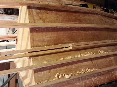 It has to be done... re-working of the double-stringer on the turtledeck. Kinda thought that when I was just thinking about it on Lombard Street after my last work session, but when I took the trip over to Woodstream and actually looked at it, it was so obvious that I should have gave into it some time ago: not only is the wood stringer uneven where I tried taking it down to a single width from a double-width but it is also uneven along the ridge line (top of it).