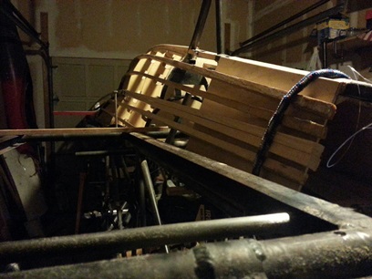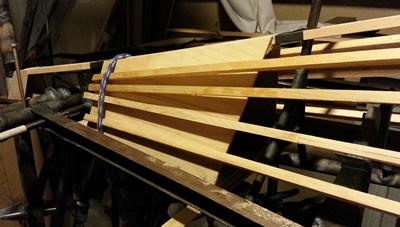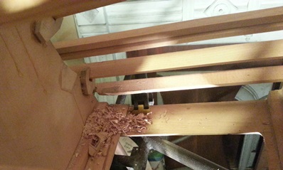 Checked the two upper stringers, on the double-stringers, to make sure things were good... the fit, ya know. A little tweaking and I glued and nailed them in place. That was the first thing on my to do list... went and did some work on additional tube supports for the heel rails then came back and used some of the thicker, more mature glue, to fill in some of the gap between the old and new stringer material.