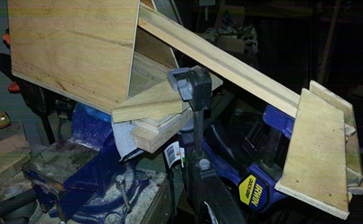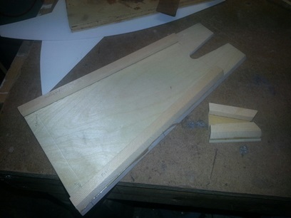 Moving right along with the new and improved tail cone? Routed out the bottom plate then glued the sides on the front and back plate. Saw that the angle was too extreme (especially for the rear plate) and took the sides off and glued on a build up block on the glue blocks so that I could sand new angles.