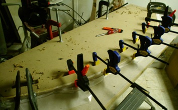 Getting back to the work at hand... had the glue mixed... spread it on like I was makin' a PB and J... and clamped her up for the night. I'll be ready to clamp the remaining three pieces of spruce tomorrow night. I better start thinking, now, of how I'm going to make that radius profile the length of the entire trailing-edge. Actually, I've been thinking... and haven't come up wtih a good solution yet. I have some ideas...