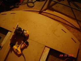 Made a "holding plate" for the brand-spankin' new router earlier in the week. It's a beaut ! 2 1/4 hp DeWalt... saweeet ! I digress... Glued a 1x2 to the holding plate so that I could make the 51 1/4" radius cut with the router. Screwed the 3/4" MDF to Gus' table. Screwed another piece of 3/4" MDF to the table so that I would have an even surface at the pivot point for the arm of the 1x2. Locked the arm into place 51 1/4" inches from the carbide bit of my brand-spakin' new DeWalt 2 1/4 hp router, flipped the switch on and 30 seconds later had a beautiful 51 1/4" radius jig.
