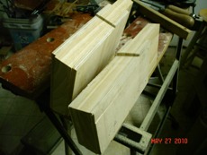 Here's a photo of the glued up spars for the Upper Wing Center Section. Wax paper helps keep the clamping ply from being permanently attached to the spar doublers.