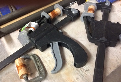 Once trimmed to size, and quadruple-checked for fit, I mixed up the glue, clamped, then tacked down with brass tacks I had from when I first started this project back in 1993 :0. Somewhere during all of this fitting and glueing up... I coated the holes that were drilled in the spars, and ribs, and then reamed them out to size again. A test fit of the painted brackets and Wa-La!... they fit like a glove.