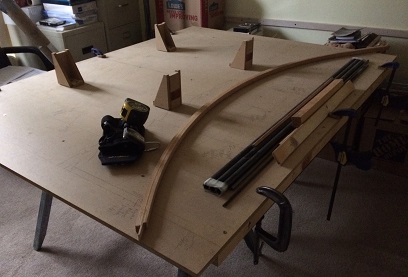 After making myself happy with the re-make of the corner blocks it still wasn't time to glue them to the center section. I still needed to glue the bow to the trailing edge of the ribs. I decided to do this beofore installing the hardware on the center section... thus, I still need to be able to remove the outer trailing ribs so that I could paint the hardware and reposition it on the spars. With that in mind, I glued up the bow to the outer two ribs and will be glueing in the corner blocks only on those two ribs. And that my friends, is where I am at...