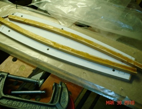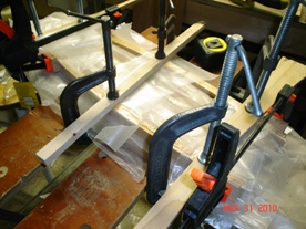 I took the short walk down to the work shop and I inspect my earlier work. The two Jerry-made cap strips, from last night, look real nice. (thanks Jim) Looks like I'll be doing the same tonight. Cut the necessary 5/8" x 1/4" strips. Mixed up the T-88. Lots of wax paper and clamps... two more completed.
